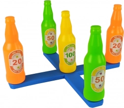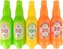 Cinci sticle în culori diferite și cu marcaj de punctaj aduc reguli clare și numeroase variante de concurs pentru întreaga familie.