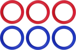 Șase inele din plastic rezistent, în două culori (roșu și albastru), permit jocul simultan pentru mai mulți copii și adulți.