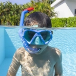 Masca cu etanșare dublă și curea reglabilă se adaptează feței copilului și asigură o fixare excelentă fără iritații.