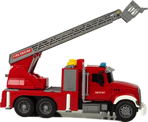 Vehiculul are în partea superioară a cabinei un orificiu galben prin care se poate turna ușor apă în interior. Când îl apăsați de câteva ori, veți vedea cum apa curge din furtunul montat în locul desemnat. Micul dvs. ajutor este gata de acțiune! Apăsați butonul din partea superioară a rezervorului și urmăriți cum începe să curgă apa! Poate stinge mici incendii. Scara se ridică cu ajutorul unei manivele.