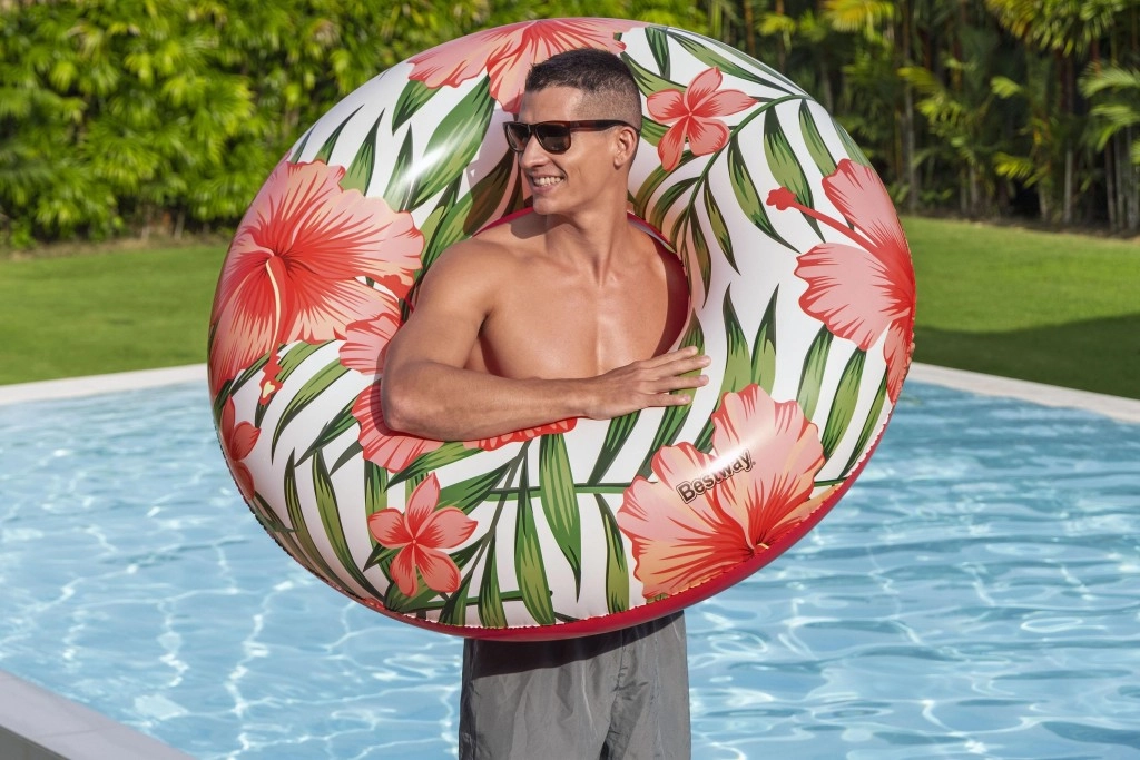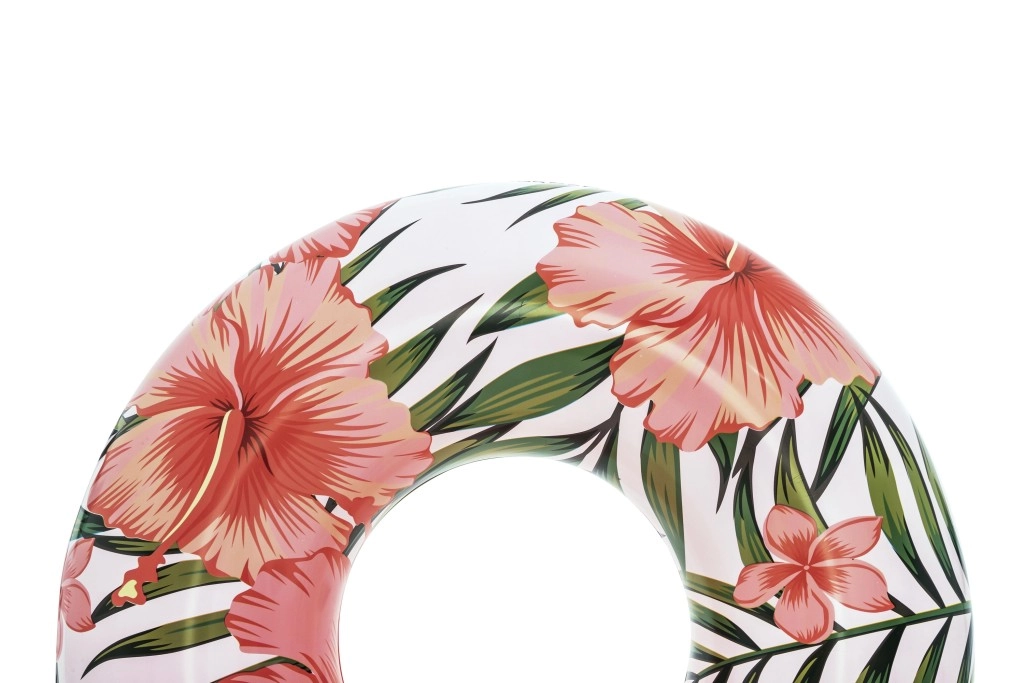 Motivul la modă cu frunze de palmier sau flori de hibiscus va înviora orice piscină și fotografiile de pe plajă. Stil și distracție într-unul singur.