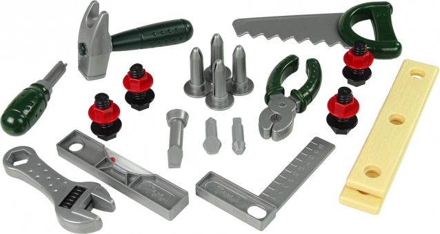 Fierăstrău, ciocan, șurubelniță, cheie reglabilă, clește combinație, șuruburi, piulițe și plăcuțe – tot ce are nevoie micul meșter pentru a exersa motricitatea fină și imaginația.