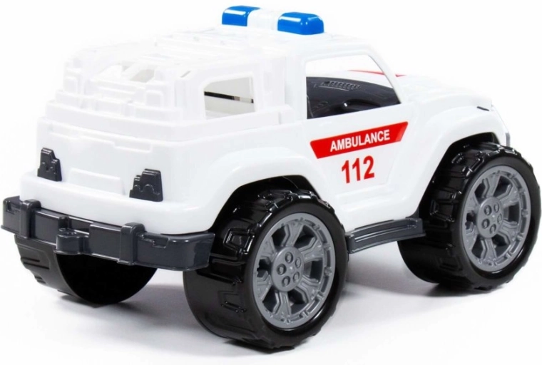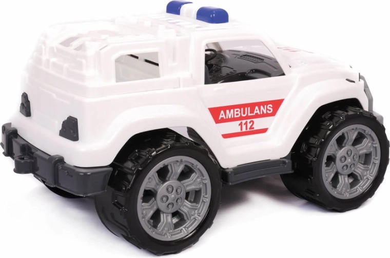 Vehiculul are un design masiv de teren, roțile mari se remarcă de la distanță și sugerează puterea mașinii. Pe laterale sunt autocolante roșii cu inscripția Ambulance, care conferă vehiculului caracter. Interiorul cuprinde cabina șoferului și partea din spate a mașinii, realizate până la cele mai mici detalii, amintind de echivalentul realist. Jucăria este un super gadget pentru orice mic iubitor de mașinuțe, iar profesia de salvator îi va îmbogăți colecția de vehicule și îi va aduce multă distracție.