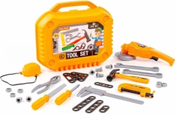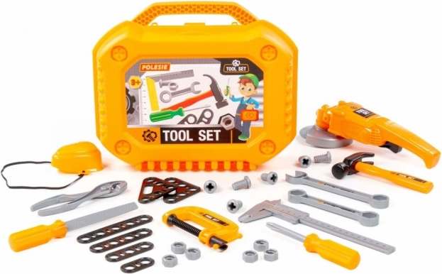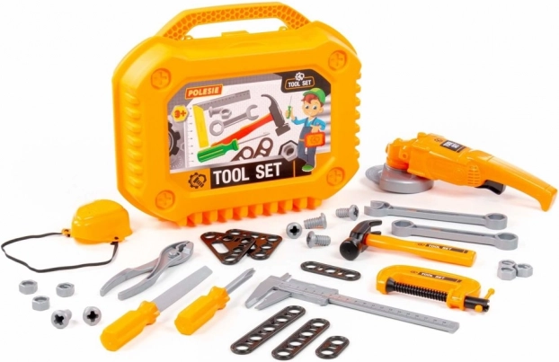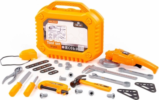 Setul de unelte pentru copii este conceput pentru micii meșteri care doresc să îi imite pe mama sau tata la lucru în atelier sau în grădină. Toate elementele sunt din plastic durabil, sigure pentru joacă și se depozitează ușor în geanta rezistentă. Polizorul rotește discul la apăsarea butonului, iar masca de protecție are elastic, astfel încât se potrivește fiecăruia.