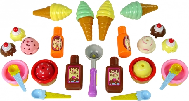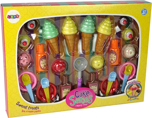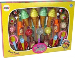 Setul de dulciuri conține cupe colorate și înghețate care vor încânta copiii. Această jucărie este ideală pentru întâlniri și petreceri de copii, unde micuții se pot bucura de o mică sărbătoare cu bunătăți arătând delicios în culori pastel care par foarte realiste. Include, de asemenea, accesorii precum linguri, pahare și sosuri care ajută la crearea atmosferei unei întâlniri dulci. Cu ajutorul unei linguri speciale de înghețată, copilul își poate crea propriile deserturi.