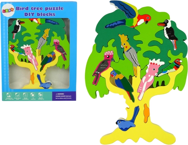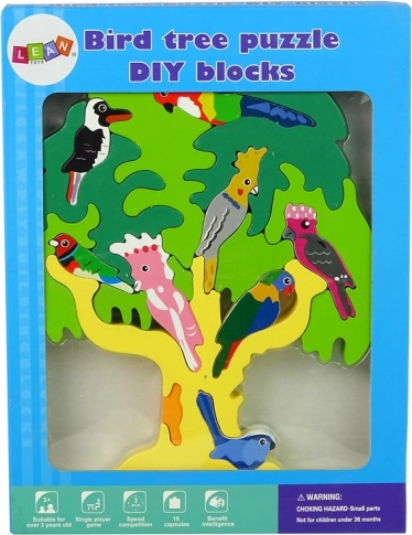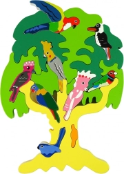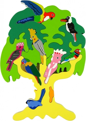 Acest puzzle din lemn în formă de copac nu este doar o distracție excelentă, ci și un suport pentru dezvoltarea copilului dumneavoastră. Copiii învață precizia, își consolidează imaginația, memoria și chiar și cunoștințele despre diferite specii de păsări, cum ar fi papagalii. Copacul finalizat, în nuanțe de verde, devine o frumoasă decorațiune în camera copilului.