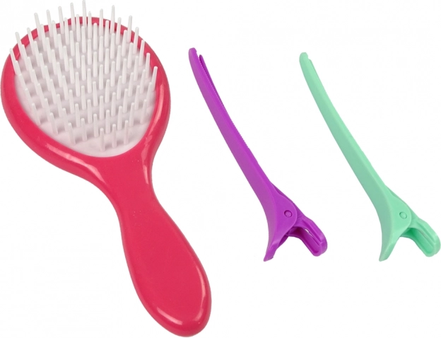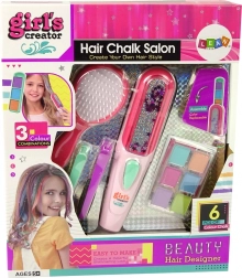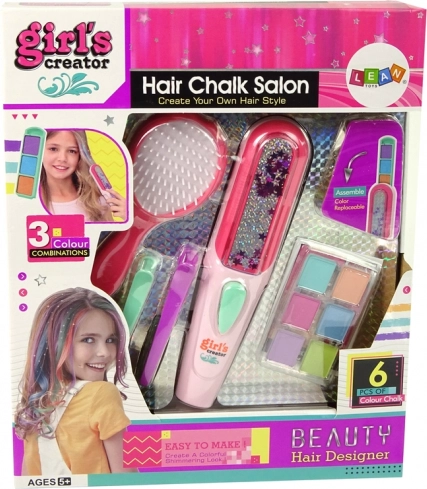 Familiarizați-vă cu setul care conține perie, placă de îndreptat, două agrafe și șase crete colorate pentru păr.