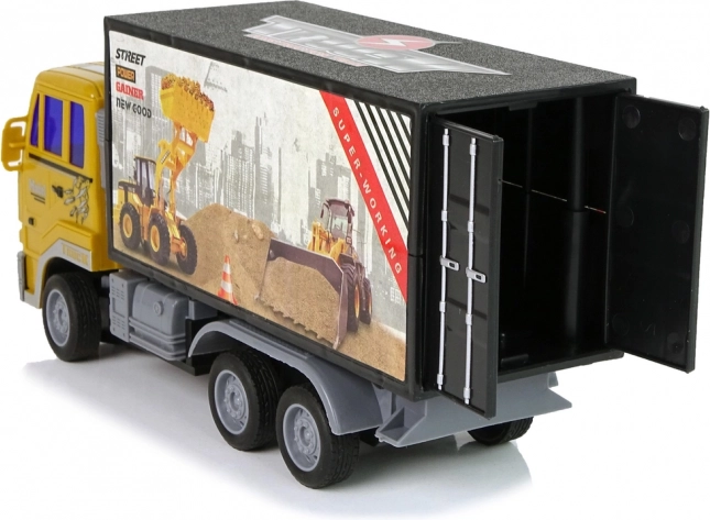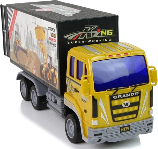 Camionul are o cabină galbenă și un container negru cu autocolante proeminente, imitând fidel o mașină de construcții reală.