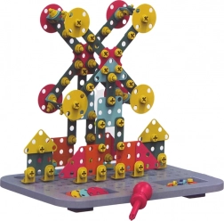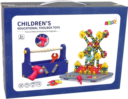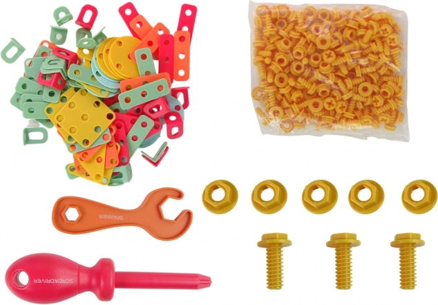 Conținutul pachetului: valiză de scule de asamblat, șurubelniță electrică pe baterii, placă de construcție, cheie plată, șurubelniță, set mare de piulițe și șuruburi, piese plate în forme geometrice.