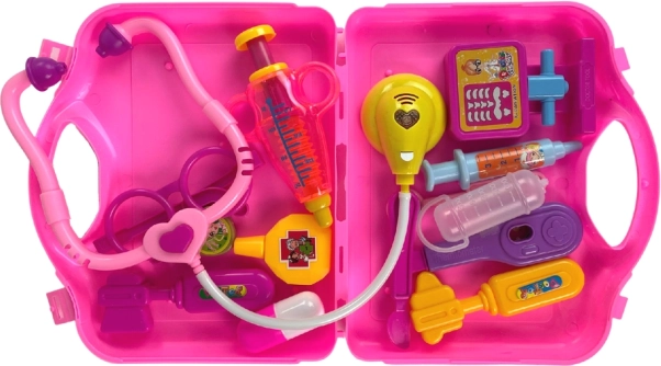 Adorabila geantă medicală roz pentru micii doctori oferă ore întregi de joc creativ și învățare. Conține instrumente din plastic sigure și un stetoscop luminos, care aprinde o inimioară când este apropiat. Copiii își exersează motricitatea fină, imaginația și depășesc mai ușor teama de vizita la medic. Totul este depozitat într-o geantă portabilă practică.