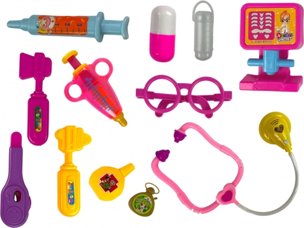 - Conținutul setului: 2x seringă, ciocănel chirurgical, radiografie, termometru, cutie mare în formă de pastilă, cutiuțe pentru „medicamente”, stetoscop cu inimioară, ochelari, cuțitaș, oglindă.