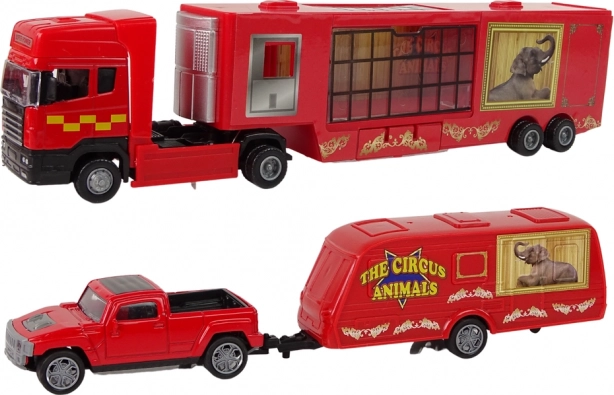 Acest set de vehicule de circ este un cadou grozav. Copilul va găsi în el un mare camion pentru transportul animalelor și o mașină pickup cu remorcă de locuit. Setul include și două feline sălbatice – un leu și un tigru. Joaca cu acest set dezvoltă creativitatea copiilor și oferă distracție grozavă pentru ore îndelungate. Camionul și pickup-ul sunt realizate din metal, ceea ce garantează robustețea și calitatea setului.