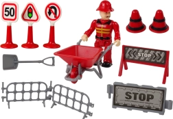 Setul include o figurină în uniformă roșie, semne de circulație, roabă și bariere. Perfect pentru jocuri de rol pe tema construcțiilor sau siguranței rutiere.