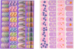 Decorați-vă unghiile folosind diferite abțibilduri modelate și sclipici praf în trei culori strălucitoare.