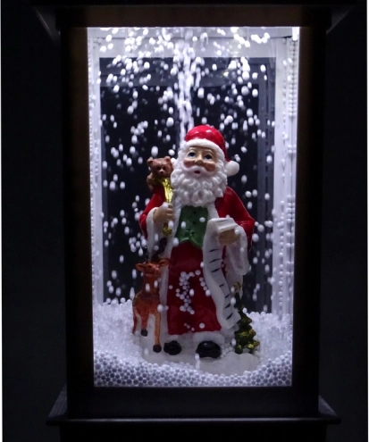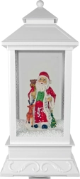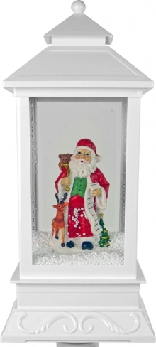 Această lanternă albă elegantă este perfectă pentru decorul de Crăciun. În interior se află un MOȘ CRĂCIUN vesel, cu un sac de cadouri și o listă lungă de dorințe. O pompă integrată circulă zăpada de la bază în sus, astfel încât în interior ninge continuu, creând un spectacol de iarnă fermecător. Construcția din plastic rezistent asigură greutate redusă și durabilitate – astfel poți folosi decorațiunea în fiecare an de Crăciun.