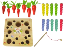 În pachet găsiți o bază din lemn cu orificii, 6 morcovi, 6 viermișori și o undiță magnetică. Fiecare morcov are o dimensiune diferită și se potrivește în orificiul corespunzător, ceea ce susține sortarea și motricitatea fină. Magnetul de la capătul undiței permite să „prindeți” ușor viermișorii – la întâmplare sau după culoare, adăugând elemente de cooperare, concentrare și joc distractiv de grădină.