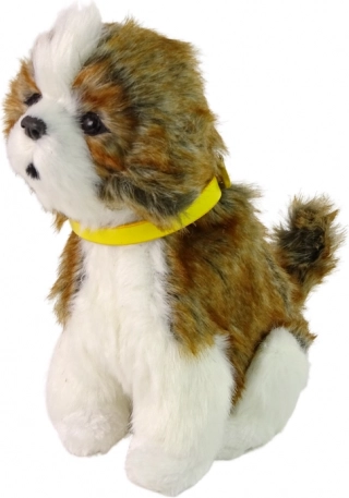 Textura de pluș în culoare alb-maro este deosebit de plăcută la atingere, iar zgarda galbenă detașabilă îi sporește farmecul. Ochii de culoare închisă cu margine maro îi conferă un aspect realist.