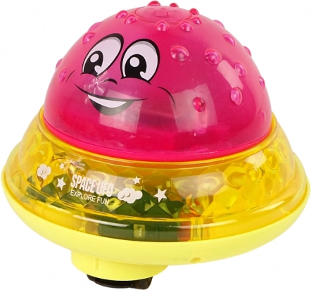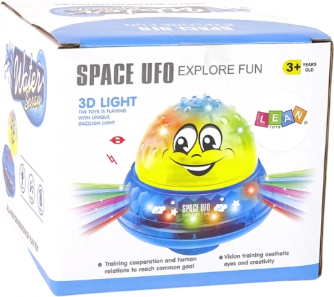 Minge de apă UFO este o jucărie din două piese care funcționează atât ziua, cât și noaptea. Are culoarea roz, cu orificii în partea de sus prin care stropește apă când este scufundată. După baie, jucăria poate fi mutată în cameră, unde o așteaptă o mică platou în forma unei farfurii zburătoare. La conectarea suprafeței mingii cu platoul, se activează muzică veselă și diode colorate, creând o mică discotecă acasă.