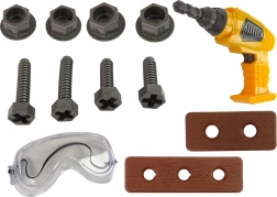 Acest set este echipat cu o bormașină pe baterii, care simulează un foraj real și produce sunete autentice. De asemenea, conține chei, șurubelniță, ciocan și alte unelte pentru joc creativ. Toate piesele sunt depozitate în siguranță într-un ambalaj colorat, care imită aspectoarele adevărate ale uneltelor.