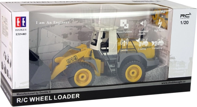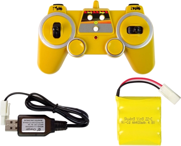 Telecomanda funcționează la 2,4 GHz, este foarte ușor de utilizat, iar cele două joystick-uri permit manevre comode. Cu ajutorul ei, operatorul poate conduce, schimba direcția înainte/înapoi și dreapta/stânga. Se deplasează pe roți cu șenile, iar brațul excavatorului se mișcă în sus și în jos. Este realizat la scara 1:20 și este decorat cu detalii negre și autocolante vizibile.