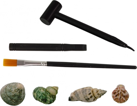 Pachetul include instrumente sigure pentru micii arheologi: dăltiță, ciocănel și pensulă. Copiii își exersează precizia, răbdarea și îndemânarea și își pot crea treptat propria colecție de scoici. Pe ambalaj vei găsi imagini ale posibilelor modele (de ex. scoica pectină, melc verde, turridae, melc cu gură neagră, melc cu colorit roșu), astfel încât recunoașterea este ușoară.
