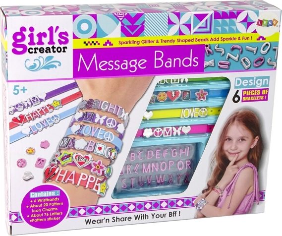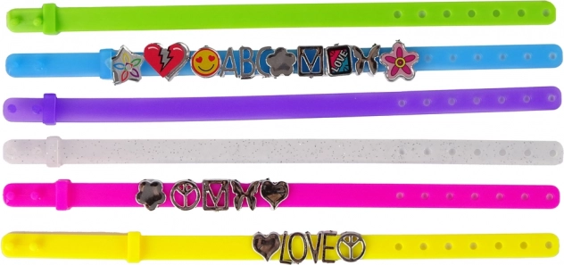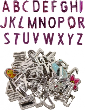 Include litere de la A la Z, forme diverse și 6 benzi de brățară cu sistem de închidere simplu.