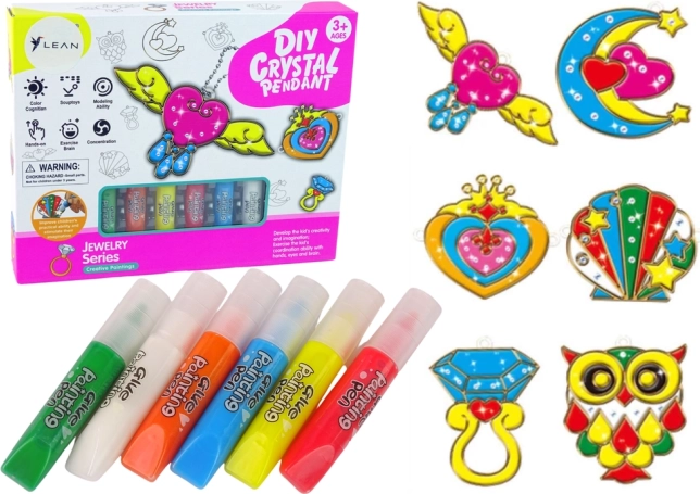 Descoperă setul creativ pentru copii: pandantive transparente tip vitraliu pentru colorare și decorare cu culori gel. Aplicare ușoară, uscare rapidă și posibilitatea de a răzui culoarea și a reîncepe. Creează-ți pandantive unice, decorațiuni pentru fereastră, brelocuri și brățări – un cadou grozav pentru micii artiști.