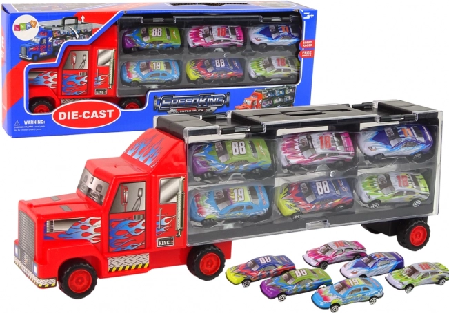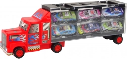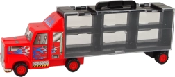 Camionul este echipat cu compartimente transparente pentru transportul mașinilor de curse. Ușor de transportat cu un mâner deasupra.