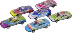 Șase mașini de curse colorate, fiecare cu modele și numere unice, destinate jocurilor de curse.