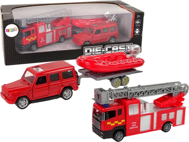 Barca gonflabilă pe remorcă permite conectarea la vehiculul selectat în funcție de tipul de salvare. Setul este completat de carduri educative cu diferite tipuri de vehicule de pompieri.