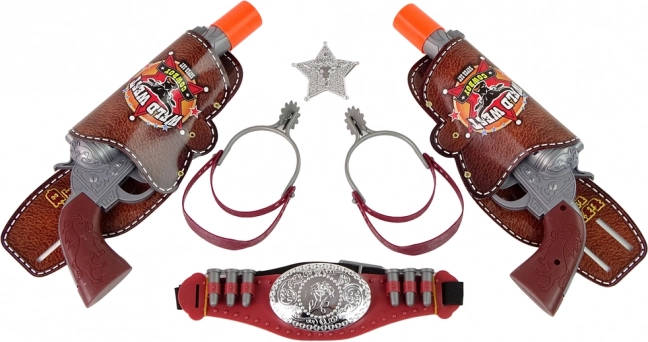 Curea cu toc, două revolvere, insignă de șerif și cătușe – tot ce are nevoie un copil pentru jocuri pline de aventură în Vestul Sălbatic.