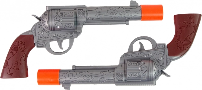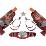 Această echipare completă de cowboy transformă orice copil într-un curajos apărător al legii. La apăsarea trăgaciului, revolverul produce un sunet realist de împușcătură (alimentare AG13), în timp ce cureaua cu toc păstrează pistoalele mereu la îndemână. Vârfurile portocalii sigure și plasticul de calitate asigură joaca fără griji, acasă sau afară.