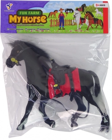 Acest cal de jucărie realist, cu suprafață fină catifelată, susține jocul creativ și imaginativ – de la povești de fermă până la aventuri călare. Datorită șeii negre și șabracului roșu accentuat, se potrivește de minune în orice colecție de figurine pentru copii.