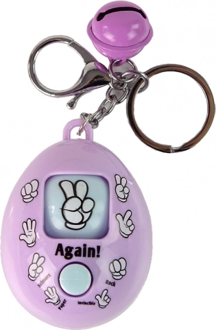 Breloc distractiv și colorat în formă de ou, cu jocul integrat piatră, foarfecă, hârtie. Doar apasă butonul central și va apărea un simbol aleatoriu. Ideal ca accesoriu stilat pentru chei, rucsac sau geantă, cu inel și carabină practice pentru prindere ușoară și un clopoțel mic care te ajută să găsești rapid cheile.