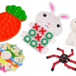 Pachetul conține în total 24 de piese: joc X și 0 (tic-tac-toe), pop it morcov, 4 figurine iepuraș, spinner + spinner Happy Easter, 3 jucării săltărețe, 6 șerpi din cauciuc, iepuraș antistres, 2 gniotci iepurași, 4 inele, 2 iepurași apăsabili, iepuraș pop it cu proeminență și 4 ouă pliabile. Datorită dimensiunilor compacte, setul este potrivit pentru călătorii și grădiniță.