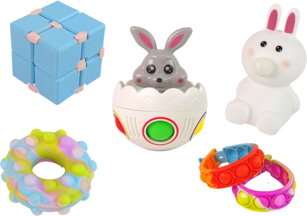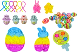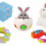 Pop it donut, brățări, iepuraș și ou, figurine de strâns și un cub fidget – perfecte pentru joc senzorial și eliberarea stresului.