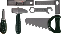 Printre unelte se numără ciocanul, ferăstraiele, șurubelnița și altele, permițând copiilor să învețe numele și utilizarea uneltelor. Totul este depozitat într-o valiză practică, ușor de transportat.