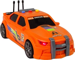 Mașina de curse portocalie, cu imprimeuri evidente, elemente sportive și detalii finisate cu grijă, atrage privirea de la prima vedere. Plasticul rezistent suportă joaca frecventă.