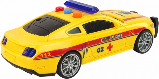 Ambulanța galbenă rapidă și rezistentă, cu inscripții vizibile „Ambulance”, îi poartă pe copii direct în centrul acțiunii de salvare. La apăsarea butoanelor se aprind LED-uri albastre deasupra cabinei și se aud sunete realiste – pornirea motorului, claxon și sirenă de avertizare. Datorită mecanismului inerțial, este suficient să apeși, să tragi înapoi și mașina pornește singură înainte.