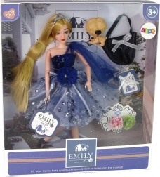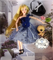 Drăgălașa păpușă Emily, în rochie albastră sclipitoare cu suprapunere din tul, va încânta toate micile iubitoare de modă. Setul include și un cățel, o poșetă elegantă cu fundă argintie și două flori pentru decorare creativă. Păpușa are membre mobile pentru poziționare ușoară și este ideală pentru jocuri de imaginație și parade de modă.