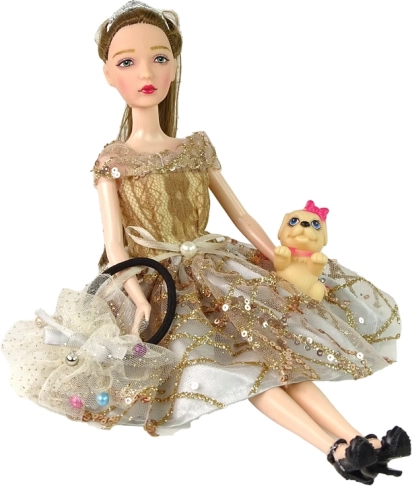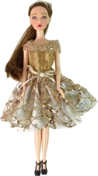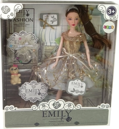 Descoperă farmecul lumii modei cu păpușa EMILY. Rochia ei aurie strălucitoare cu panglică în talie, coafura aranjată și pantofiorii negri cu ornament transformă această păpușă într-o însoțitoare elegantă pentru joaca de zi cu zi. Ochii albaștri și detaliile fine oferă un aspect realist și fermecător.