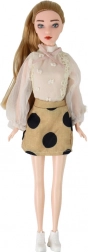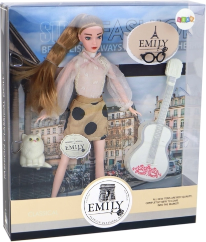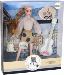 Păpușa Emily încântă prin aspectul elegant: o bluză albă translucidă cu detalii, fustă maro cu buline negre și adidași albi. Părul blond lung prins în coadă este completat de ochelari negri. Chitara albă cu ornamente roz invită la joc creativ și la inventarea propriilor povești, alături de pisicuța fidelă.