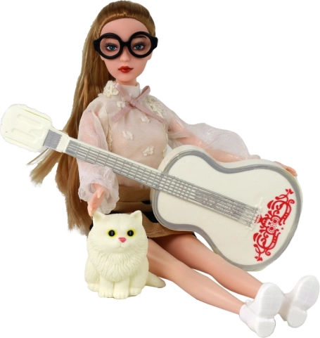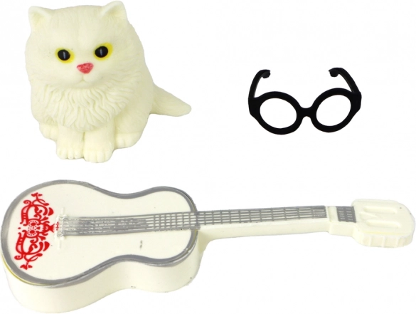 - Set complet de accesorii: păpușă, chitară, ochelari și pisicuță.