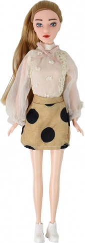 Emily are păr lung, ușor de pieptănat, un outfit modern cu fustă cu buline și ochelari care îi completează stilul personal.