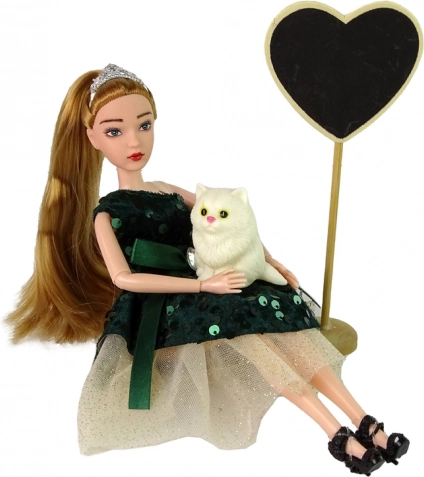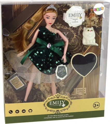 Fermecătoarea păpușă Emily, într-o rochiță verde sticlă cu paiete și tiară, vine într-un set cu un drăgălaș pisoiaș alb și o mare inimă din lemn pe suport. Datorită membrelor mobile și finisajului de calitate, stimulează jocul creativ și imaginația copiilor.