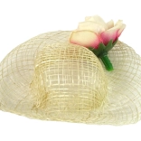 Pălăria bej cu floare completează frumos rochia florală cu fundă și pietricică – un look perfect pentru orice ocazie.