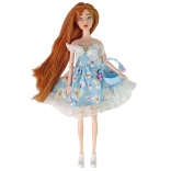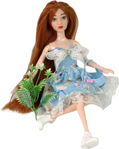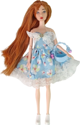 Rochia albastră cu model floral și detalii din dantelă evidențiază stilul de primăvară al păpușii Emily.