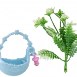 Geanta albastră elegantă și florile adaugă farmec fiecărei scenete și susțin jocul de rol.