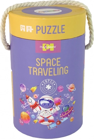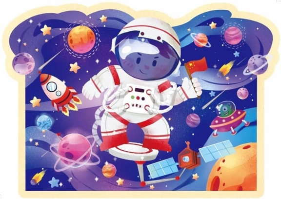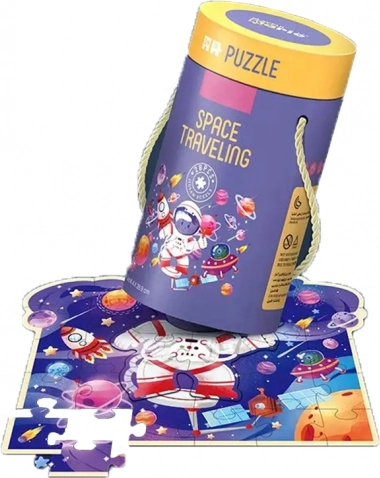 Ilustrațiile includ un mic astronaut într-un mediu plin de planete, rachete și sateliți, care atrag copilul într-o aventură spațială colorată și detaliată. Ambalajul într-un tub rotund convenabil permite o transportare și depozitare ușoară, ideal pentru utilizare acasă sau în călătorii.