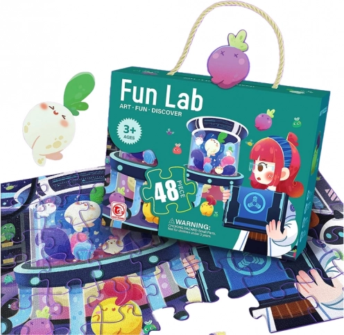 Amuzantul puzzle pentru copii cu tematică de laborator, cu animăluțe, din 48 de piese, dezvoltă imaginația, răbdarea și motricitatea fină. Piesele sunt mari (aprox. 9 x 7 cm) și se asamblează ușor; imaginea finală are 50 x 34 cm. Execuție de calitate pentru utilizări repetate, potrivit de la 3 ani, conform EN 71.